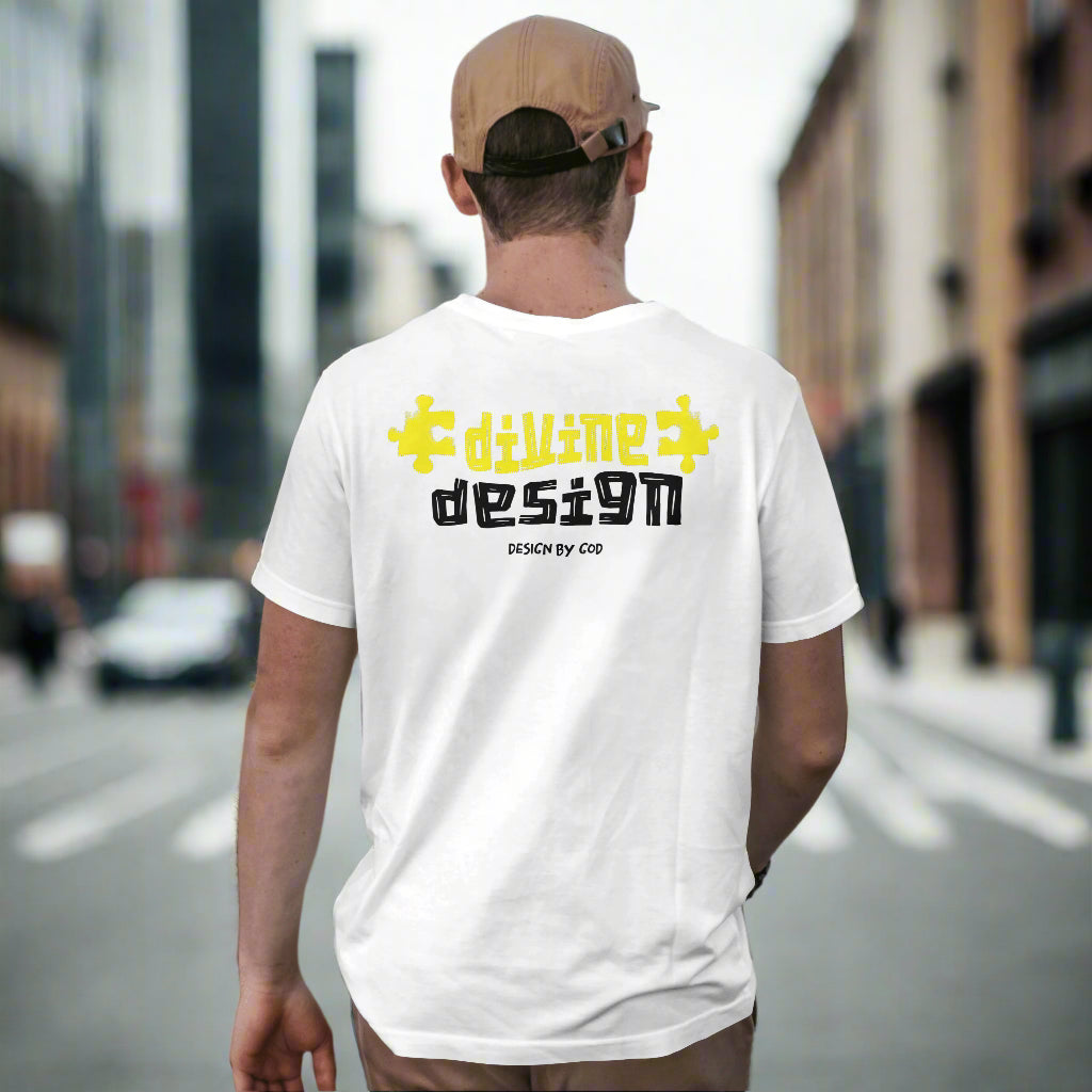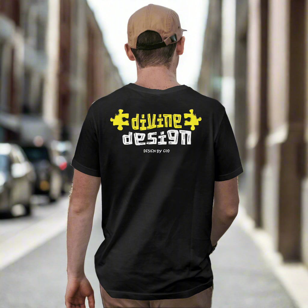 Bold “Divine Design” back graphic with puzzle accents